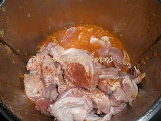 Adicione as moelas, o sal, o colorau, o louro, o vinho, envolva bem e programe 45 min. 100º, colher inversa, Vel. colher